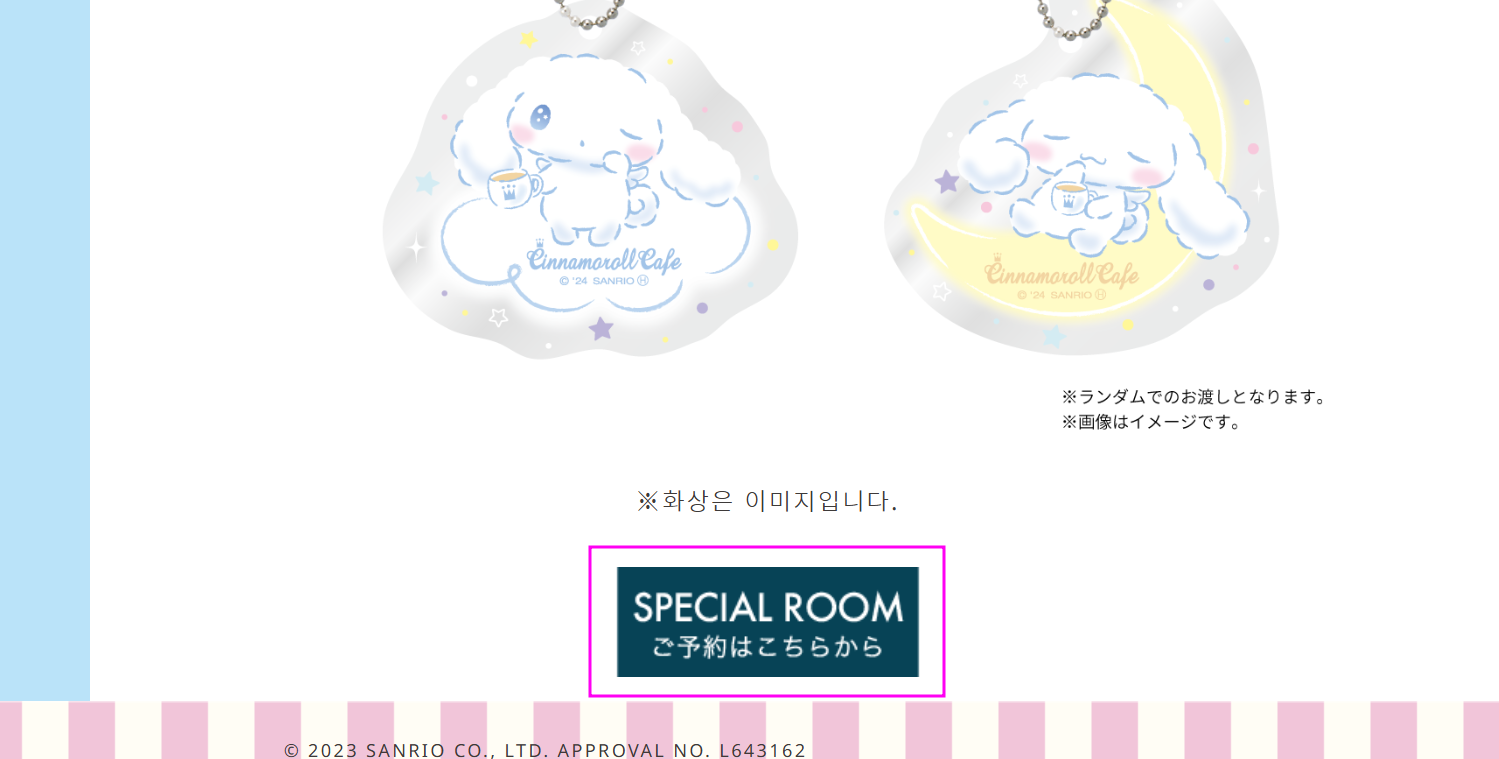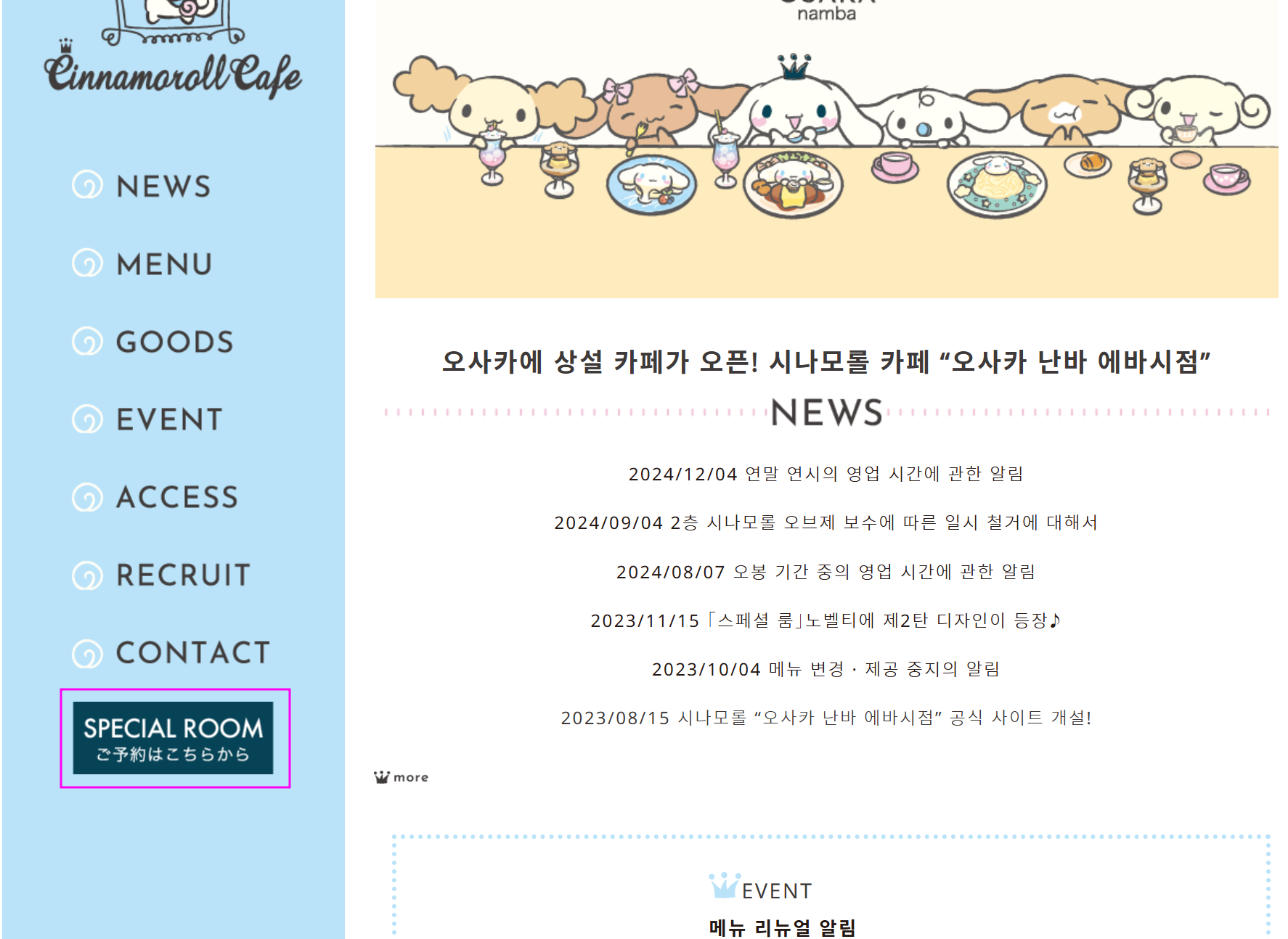 - 공식 예약 사이트 접속 – 시나모롤 카페 공식 사이트 접속 후 'SPECIAL ROOM' 탭 클릭 → SPECIAL ROOM 페이지 하단에 'SPECIAL ROOM' 탭 다시 클릭